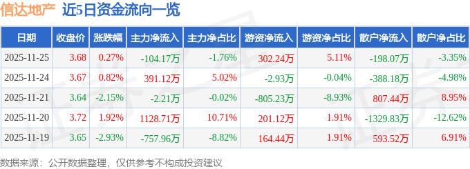 证券之星消息,截至2025年11月25日收盘,信达地产(600657)报收于3.68元,上涨0.27%,换手率0.56%,成交量16.06万手,成交额5918.17万元。