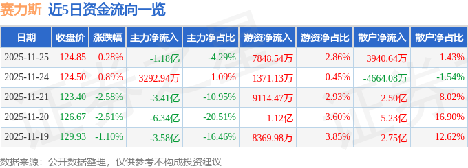 证券之星消息,截至2025年11月25日收盘,赛力斯(601127)报收于124.85元,上涨0.28%,换手率1.45%,成交量21.83万手,成交额27.48亿元。
