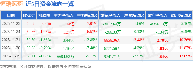 证券之星消息,截至2025年11月25日收盘,恒瑞医药(600276)报收于60.88元,上涨0.36%,换手率0.42%,成交量26.5万手,成交额16.21亿元。