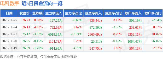 证券之星消息,截至2025年11月25日收盘,电科数字(600850)报收于26.23元,上涨0.38%,换手率1.12%,成交量7.62万手,成交额2.01亿元。
