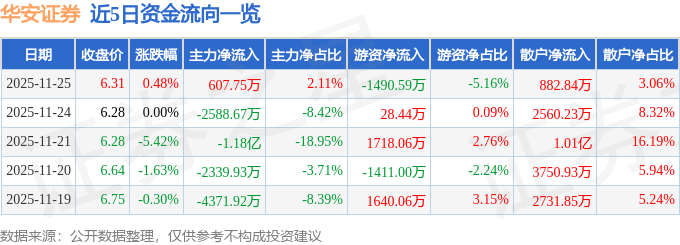 证券之星消息,截至2025年11月25日收盘,华安证券(600909)报收于6.31元,上涨0.48%,换手率0.97%,成交量45.46万手,成交额2.89亿元。
