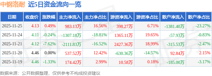 证券之星消息,截至2025年11月25日收盘,中钢洛耐(688119)报收于4.13元,上涨0.49%,换手率1.28%,成交量14.4万手,成交额5936.23万元。
