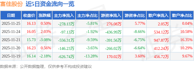 证券之星消息,截至2025年11月25日收盘,富佳股份(603219)报收于16.13元,上涨0.5%,换手率0.53%,成交量2.95万手,成交额4788.07万元。
