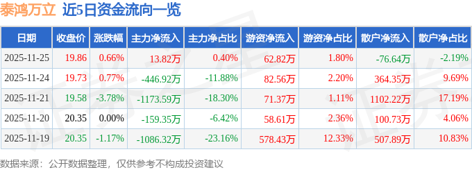 证券之星消息,截至2025年11月25日收盘,泰鸿万立(603210)报收于19.86元,上涨0.66%,换手率2.33%,成交量1.76万手,成交额3496.93万元。
