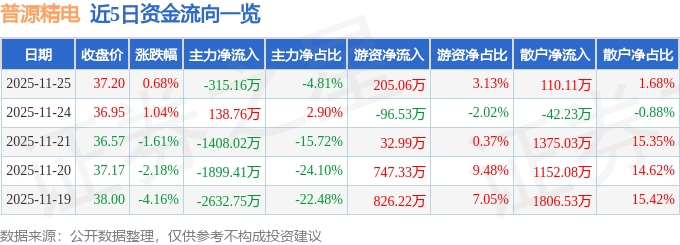 11月25日的资金流向数据方面,主力资金净流出315.16万元,占总成交额4.81%,游资资金净流入205.06万元,占总成交额3.13%,散户资金净流入110.11万元,占总成交额1.68%。