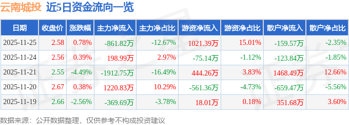 证券之星消息,截至2025年11月25日收盘,云南城投(600239)报收于2.58元,上涨0.78%,换手率1.65%,成交量26.43万手,成交额6803.5万元。