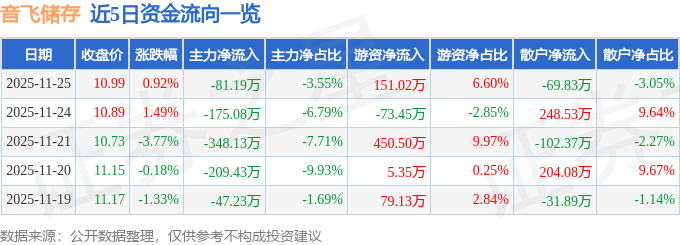 证券之星消息,截至2025年11月25日收盘,音飞储存(603066)报收于10.99元,上涨0.92%,换手率0.7%,成交量2.07万手,成交额2286.84万元。