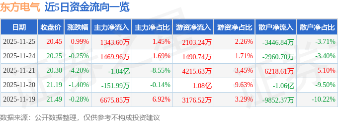 证券之星消息,截至2025年11月25日收盘,东方电气(600875)报收于20.45元,上涨0.99%,换手率2.0%,成交量45.22万手,成交额9.29亿元。
