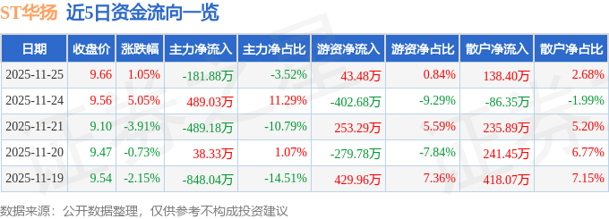 证券之星消息,截至2025年11月25日收盘,ST华扬(603825)报收于9.66元,上涨1.05%,换手率2.11%,成交量5.34万手,成交额5162.52万元。
