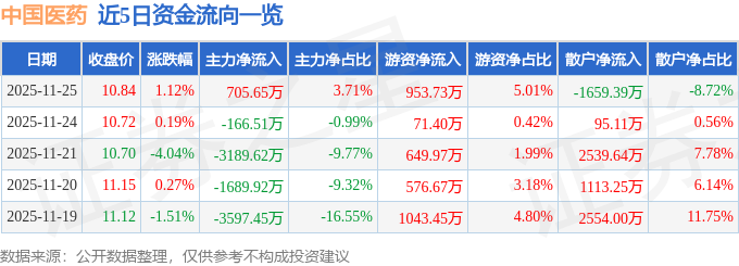 证券之星消息,截至2025年11月25日收盘,中国医药(600056)报收于10.84元,上涨1.12%,换手率1.18%,成交量17.59万手,成交额1.9亿元。