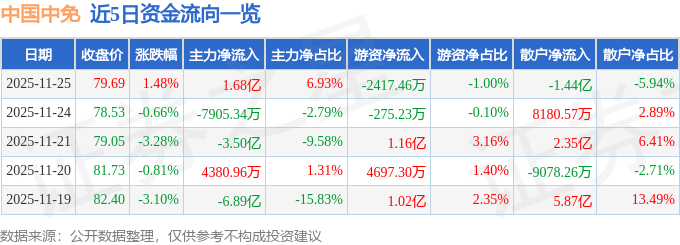 证券之星消息,截至2025年11月25日收盘,中国中免(601888)报收于79.69元,上涨1.48%,换手率1.56%,成交量30.54万手,成交额24.28亿元。