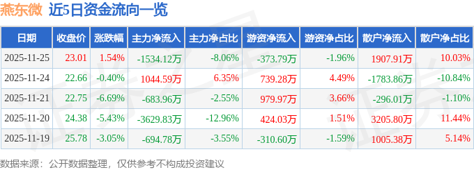 11月25日的资金流向数据方面,主力资金净流出1534.12万元,占总成交额8.06%,游资资金净流出373.79万元,占总成交额1.96%,散户资金净流入1907.91万元,占总成交额10.03%。