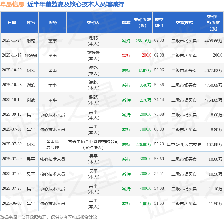 卓易信息近半年内的董监高及核心技术人员增减持详情如下:
