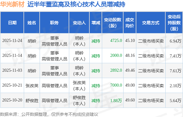 华光新材近半年内的董监高及核心技术人员增减持详情如下: