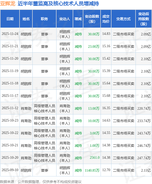 亚辉龙近半年内的董监高及核心技术人员增减持详情如下: