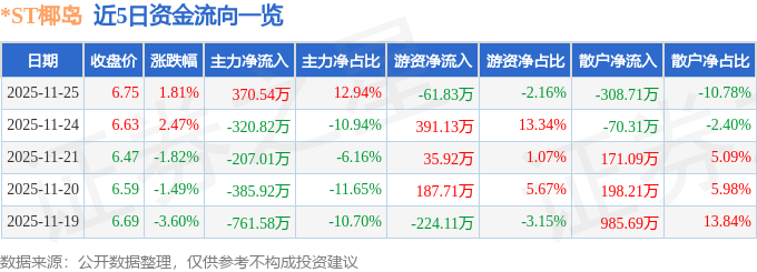 证券之星消息,截至2025年11月25日收盘,*ST椰岛(600238)报收于6.75元,上涨1.81%,换手率0.96%,成交量4.26万手,成交额2864.17万元。