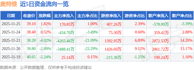 证券之星消息,截至2025年11月25日收盘,奥特维(688516)报收于39.1元,上涨1.82%,换手率1.39%,成交量4.36万手,成交额1.7亿元。