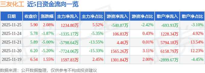 证券之星消息,截至2025年11月25日收盘,三友化工(600409)报收于5.9元,上涨2.08%,换手率1.84%,成交量37.95万手,成交额2.24亿元。