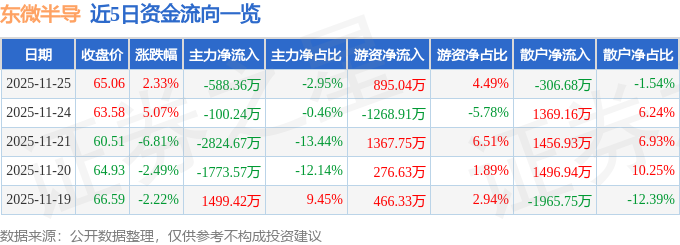 证券之星消息,截至2025年11月25日收盘,东微半导(688261)报收于65.06元,上涨2.33%,换手率2.48%,成交量3.03万手,成交额1.99亿元。