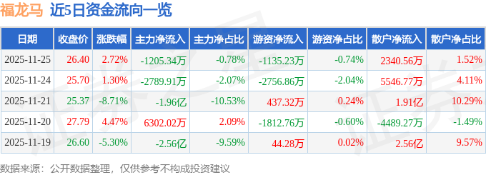 证券之星消息,截至2025年11月25日收盘,福龙马(603686)报收于26.4元,上涨2.72%,换手率14.05%,成交量58.37万手,成交额15.39亿元。