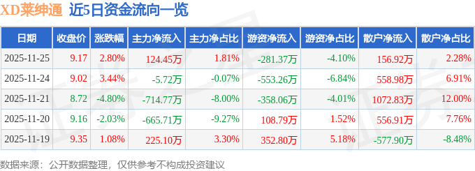 11月25日的资金流向数据方面,主力资金净流入124.45万元,占总成交额1.81%,游资资金净流出281.37万元,占总成交额4.1%,散户资金净流入156.92万元,占总成交额2.28%。