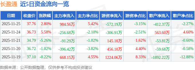 11月25日的资金流向数据方面,主力资金净流入984.56万元,占总成交额5.42%,游资资金净流出572.19万元,占总成交额3.15%,散户资金净流出412.37万元,占总成交额2.27%。