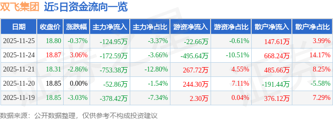 证券之星消息,截至2025年11月25日收盘,双飞集团(300817)报收于18.8元,下跌0.37%,换手率1.56%,成交量1.96万手,成交额3702.41万元。