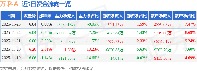 证券之星消息,截至2025年11月25日收盘,万 科A(000002)报收于6.04元,上涨0.0%,换手率0.99%,成交量96.07万手,成交额5.81亿元。