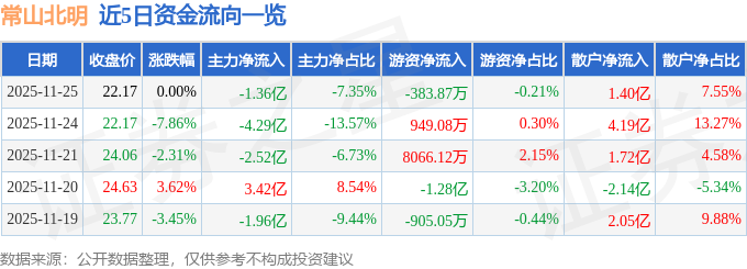 11月25日的资金流向数据方面,主力资金净流出1.36亿元,占总成交额7.35%,游资资金净流出383.87万元,占总成交额0.21%,散户资金净流入1.4亿元,占总成交额7.55%。