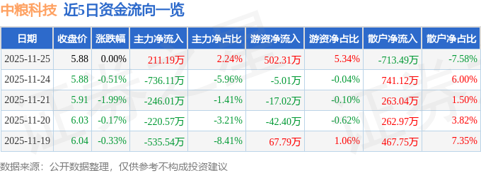 证券之星消息,截至2025年11月25日收盘,中粮科技(000930)报收于5.88元,上涨0.0%,换手率0.86%,成交量16.0万手,成交额9411.13万元。