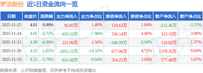 11月25日的资金流向数据方面,主力资金净流入91.83万元,占总成交额1.4%,游资资金净流入120.63万元,占总成交额1.84%,散户资金净流出212.46万元,占总成交额3.25%。