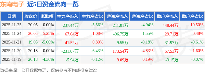 证券之星消息,截至2025年11月25日收盘,东南电子(301359)报收于20.05元,上涨0.0%,换手率3.09%,成交量2.11万手,成交额4270.35万元。