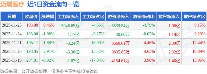 证券之星消息,截至2025年11月25日收盘,迈瑞医疗(300760)报收于193.88元,上涨0.46%,换手率0.49%,成交量5.97万手,成交额11.57亿元。