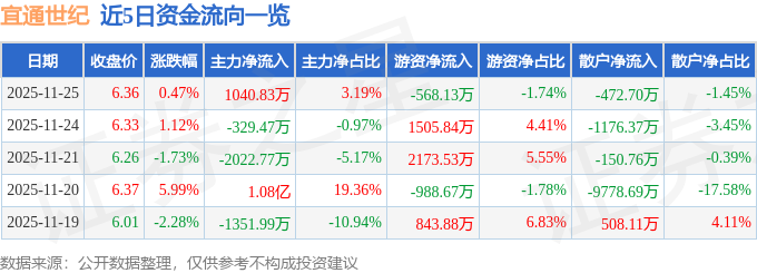 证券之星消息,截至2025年11月25日收盘,宜通世纪(300310)报收于6.36元,上涨0.47%,换手率7.38%,成交量51.08万手,成交额3.27亿元。