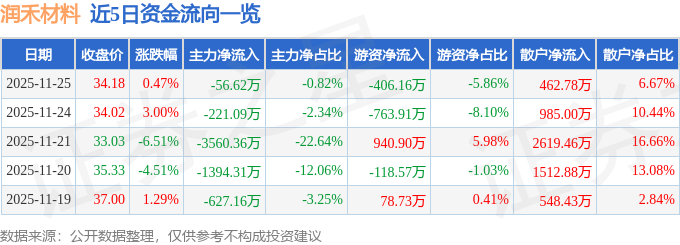 证券之星消息,截至2025年11月25日收盘,润禾材料(300727)报收于34.18元,上涨0.47%,换手率1.25%,成交量2.01万手,成交额6935.17万元。