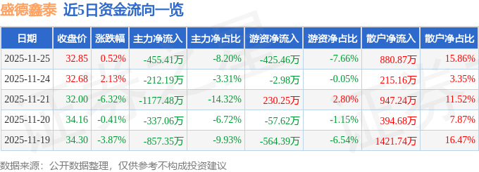 证券之星消息,截至2025年11月25日收盘,盛德鑫泰(300881)报收于32.85元,上涨0.52%,换手率2.92%,成交量1.68万手,成交额5554.38万元。
