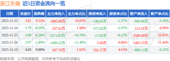 证券之星消息,截至2025年11月25日收盘,浙江永强(002489)报收于3.81元,上涨0.53%,换手率1.4%,成交量26.8万手,成交额1.02亿元。