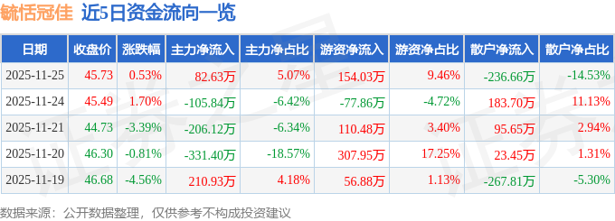 11月25日的资金流向数据方面,主力资金净流入82.63万元,占总成交额5.07%,游资资金净流入154.03万元,占总成交额9.46%,散户资金净流出236.66万元,占总成交额14.53%。