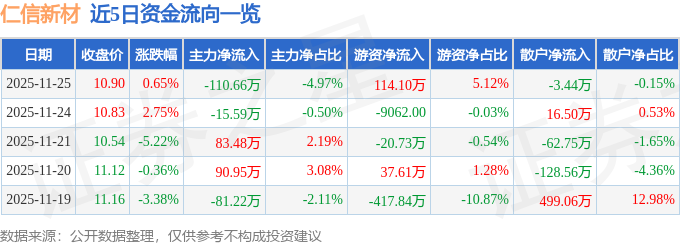 11月25日的资金流向数据方面,主力资金净流出110.66万元,占总成交额4.97%,游资资金净流入114.1万元,占总成交额5.12%,散户资金净流出3.44万元,占总成交额0.15%。