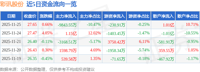 证券之星消息,截至2025年11月25日收盘,彩讯股份(300634)报收于27.65元,上涨0.66%,换手率7.76%,成交量33.71万手,成交额9.4亿元。