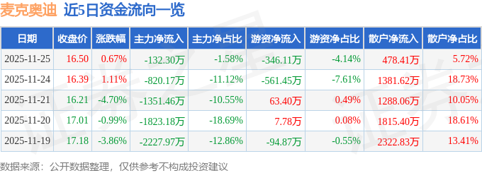 证券之星消息,截至2025年11月25日收盘,麦克奥迪(300341)报收于16.5元,上涨0.67%,换手率0.98%,成交量5.04万手,成交额8368.56万元。