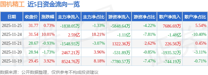 证券之星消息,截至2025年11月25日收盘,国机精工(002046)报收于31.77元,上涨0.73%,换手率8.27%,成交量43.75万手,成交额13.87亿元。