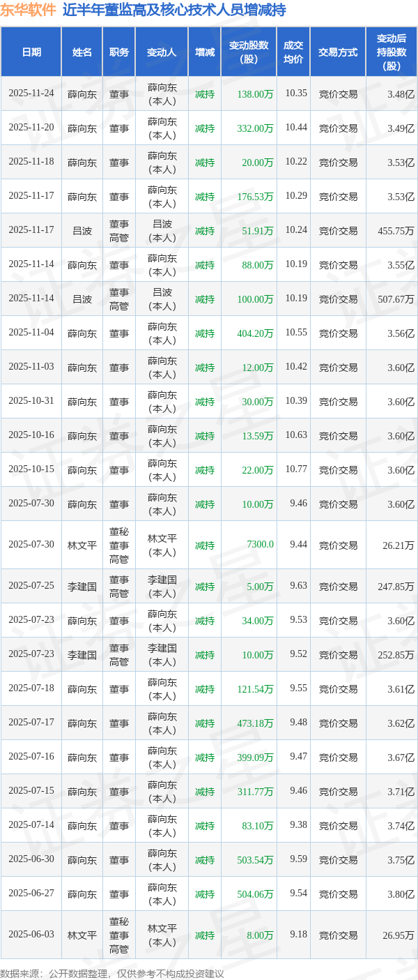 东华软件近半年内的董监高及核心技术人员增减持详情如下: