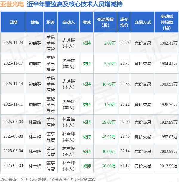 亚世光电近半年内的董监高及核心技术人员增减持详情如下: