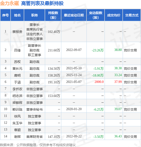 金力永磁的高管列表及最新持股情况如下: