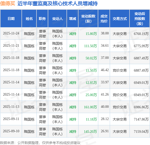 证券之星消息,根据11月25日市场公开信息、上市公司公告及交易所披露数据整理,值得买(300785)最新董监高及相关人员股份变动情况:2025年11月24日公司董事,高管隋国栋共减持公司股份15.8万股,占公司总股本为0.0795%。变动期间公司股价上涨9.05%,11月24日当日收盘报47.0元。
