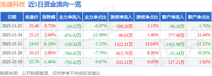 证券之星消息,截至2025年11月25日收盘,浩通科技(301026)报收于25.4元,上涨0.75%,换手率1.81%,成交量2.02万手,成交额5143.64万元。