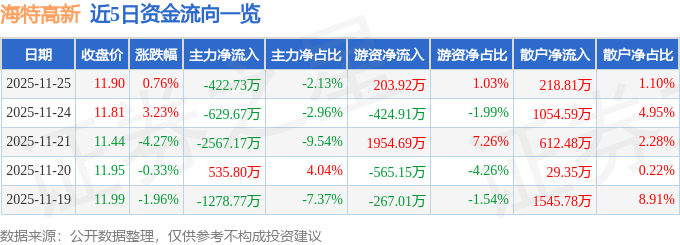 证券之星消息,截至2025年11月25日收盘,海特高新(002023)报收于11.9元,上涨0.76%,换手率2.24%,成交量16.63万手,成交额1.99亿元。
