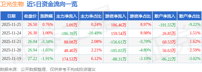 证券之星消息,截至2025年11月25日收盘,卫光生物(002880)报收于26.5元,上涨0.76%,换手率0.35%,成交量7829.0手,成交额2078.03万元。
