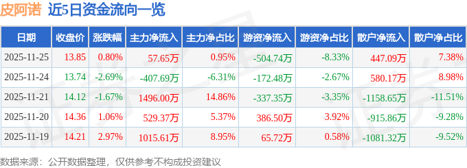 证券之星消息,截至2025年11月25日收盘,皮阿诺(002853)报收于13.85元,上涨0.8%,换手率3.4%,成交量4.37万手,成交额6056.04万元。